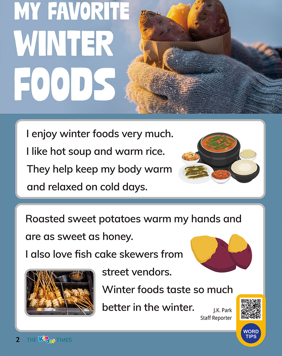 1. What winter foods does the writer like? 2. Why are roasted sweet potatoes good?